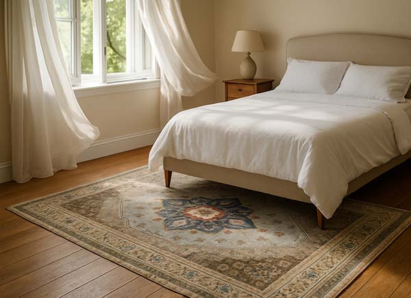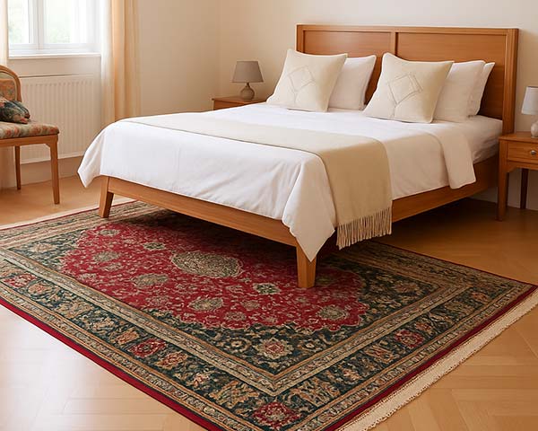 Pièce de repos par excellence, la chambre est un endroit idéal pour un tapis d’Orient vert. Sa teinte calme favorise la détente profonde et un sommeil réparateur. Ce tapis s’harmonise parfaitement avec des éléments déco naturels, comme un fauteuil en rotin, des coussins en lin beige ou des rideaux en coton clair. Associé à des plantes vertes ou à des lampes à lumière douce, il transforme la chambre en un refuge apaisant où le corps et l’esprit se ressourcent en toute quiétude.