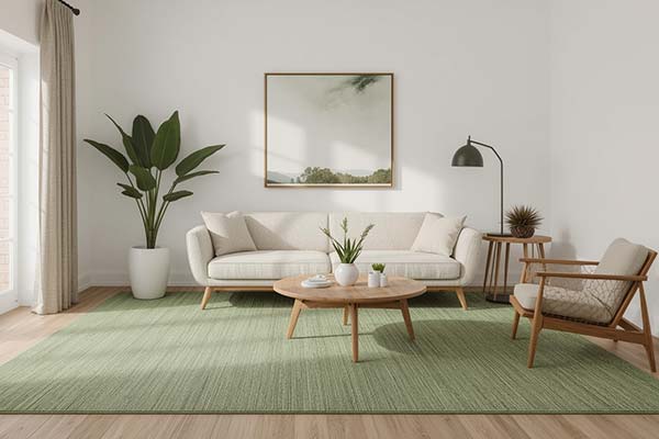 Dans une décoration d’intérieur, un tapis vert atténue la luminosité agressive et équilibre les contrastes entre les éléments. Installé au sol, il crée un espace où lire, discuter ou simplement se reposer. La teinte soulage les émotions, diminue les tensions nerveuses et limite les distractions liées à un environnement trop chargé ou trop froid.